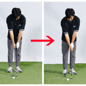 まずSWのフェースを大きく開き、オープンに構えます。そしてバックスイングでコックを早めに使い、ヘッドを高い位置へ。こうして鋭角に打てる態勢を整えたら、手首をやわらかく使ってヘッドを走らせます。