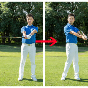ヘッドの軌道は、個人差がありますが10~20度くらいのゆるやかなアーク(弧)を描きます。飛球線方向から見て、シャフトの傾きが変わらないまま動くことがポイントです。