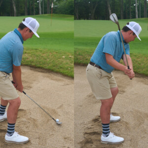 伸び上がるとクラブのリリースが早くなってしまうのですが、沈み込むイメージをもちつつ重心を下げて手元も低く下げると、ダウンスイングの前半でシャフトをしならせることができるため、パワーとスピードが増します。
