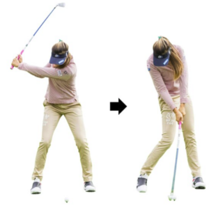それ以上大きく上げると、ボールと目の距離が離れすぎてオーバースイングになってしまうので、下半身の動きを抑えて防ぎましょう。
