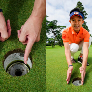 横尾選手のバックスイングは、腕の回旋を抑えて大きなスイングアークを描きます。ここまでは伊澤選手と似ていますが、切り返しからのタメが大きく、クラブが背中から下りてくるように動いています(⑤)。こうするとクラブをインサイドから下ろしやすくなる。