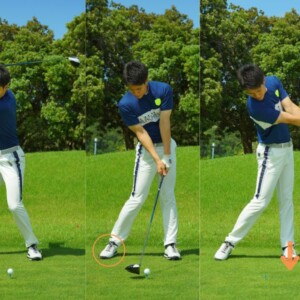 クラブがグルンと回って、ヘッドが走る感覚がつかめます。手打ちになるとテンプラになるので注意してください。