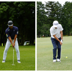 足を使って打つために、クレイジーがまず変更したのがアドレス。藤井が「こんなに狭くていいんですか?」と不安になるほど狭めさせ、「ハ」の字に開いていた両ツマ先を閉じて内股で構えてもらった