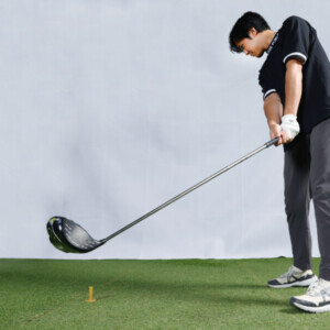 実際のドライバーは超短尺ドライバーとは当然長さが違うので、まったく同じというワケではありませんが、家でしていたことをここでも再現するようにします。ドライバーでは飛距離を期待するので、(ダメだと知っていても)飛ばそうと振り急いだり、叩きにいってしまったりで、つい力が入りスイングを崩してしまいがちです。