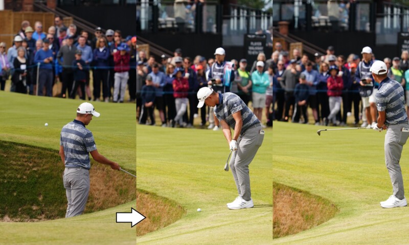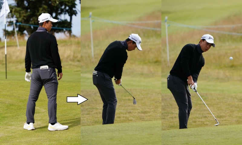 こちらも昨年の「スコティッシュオープン」での出来事。5番ホールのモリカワのティーショットは、桂川と同じようなシチュエーションにボールが止まった。最初はバンカー内にスタンスをとって打とうとしたが、ボールは腰の高さ、ピンまでの方向はバンカー越えになるので、ミスショットすればボールはバンカー内に。結果、コリンも左打ちで対処。見事にグリーンオンさせて寄せワンを決めた。