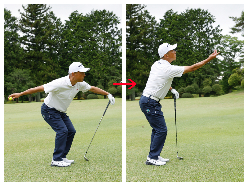 ボールの落としどころまでの距離が長くなるとルックアップをしがちになるが、これはミスのもと(×)。クラブヘッドがボールをとらえるのを確認するまで顔は地面に向けて置く。インパクト後にボールを目で追うときも、上体を起こさず前傾姿勢をキープしたままボールを追う見方をしよう