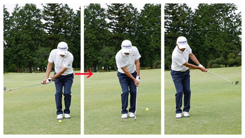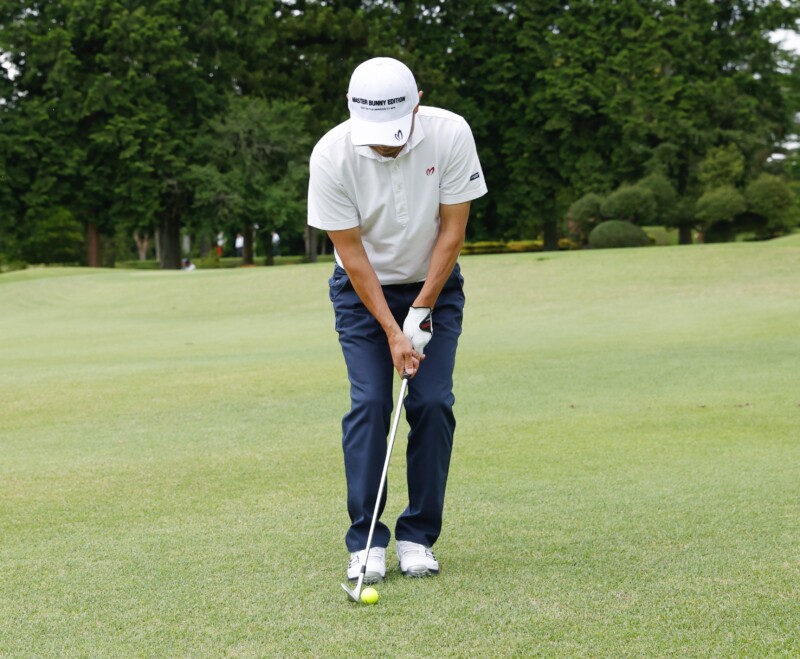 まずは、ボールを右足ツマ先の前にセットします。両手は左足太モモの内側の前なので、アドレスは両腕とクラブで小文字の「y」の形ができます。