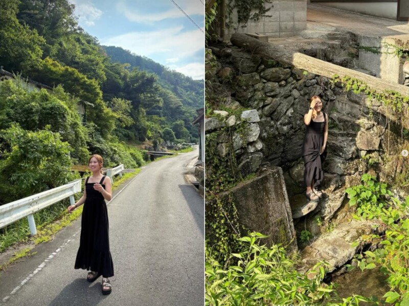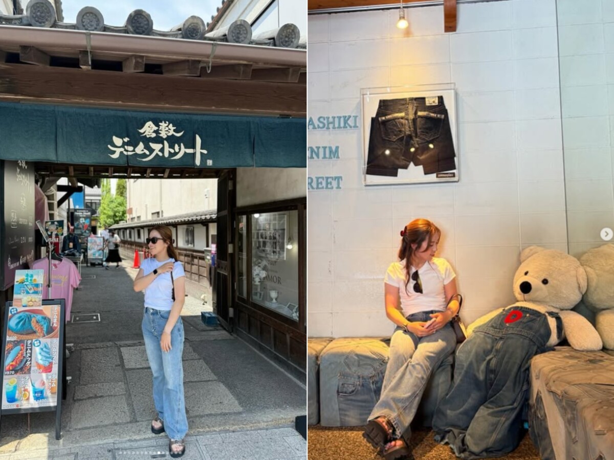 投稿では、肩を出した黒のワンピースで町を散策する姿、岡山名物のマスカットをお盆にのせて満面の笑みを浮かべる一枚に加え、「倉敷デニムストリート」で大きなクマのぬいぐるみと並ぶ2ショットなど、旅気分を存分に届ける写真が多数アップされています。