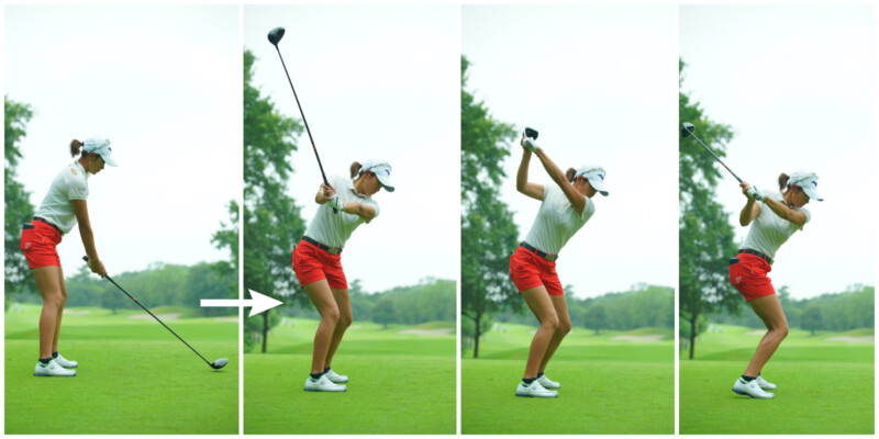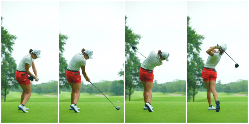 背が高く、トップも高い原英莉花は“丸めた背中”と“右側インパクト”で飛ばす!