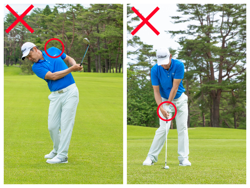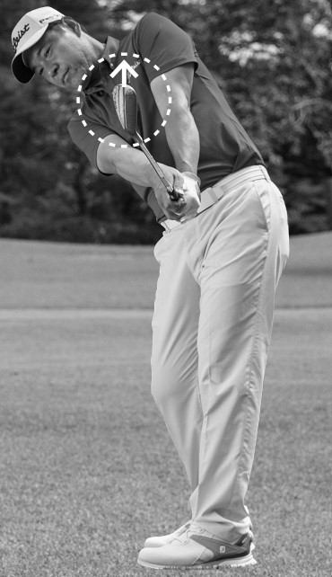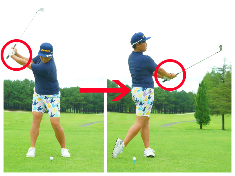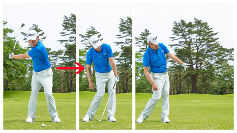 左腕を長く使えばフォローでは左ヒジが下を向き、ヘッドの先端が上を向く。左ヒジから先が自然にターンし、ボールを正確にとらえられる