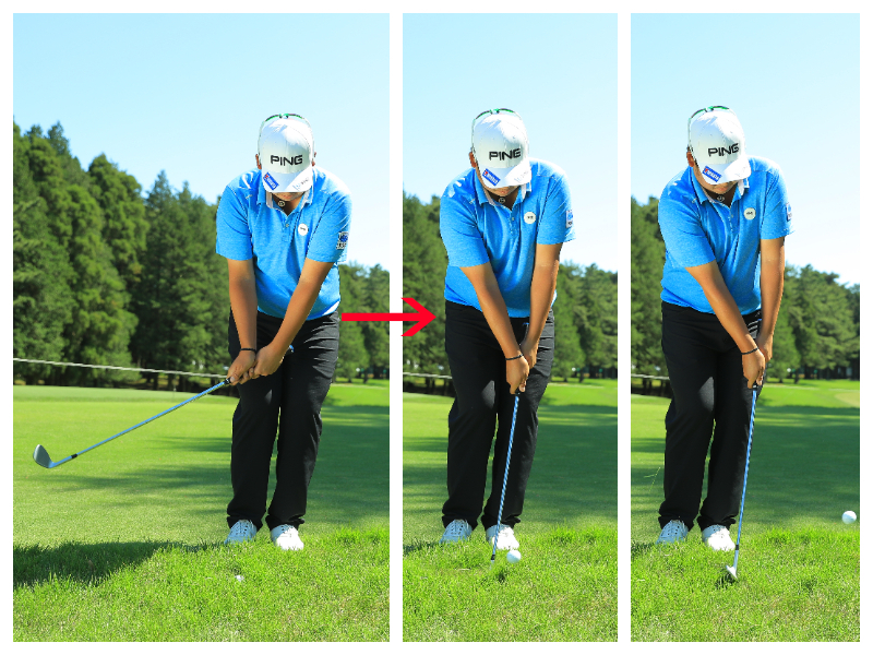 振り幅が自然にコンパクトになるうえに、アドレスよりもロフトを立てるハンドファーストで打てるので、ボールをうまくミートできますよ。