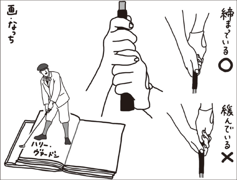 PGA(日本プロゴルフ協会)の教本では、グリップの形はオーバーラッピングの握り方が基本とされています。イラストのように右手の小指を左手の人差し指と中指の間に乗せて、両手の一体化を高めます。このグリップの仕方は「物を握る」としては特殊、ゴルフならではの握り方なので、すごく握りにくいと感じるでしょう。私もゴルフをはじめたころは気持ち悪くて仕方がありませんでした。