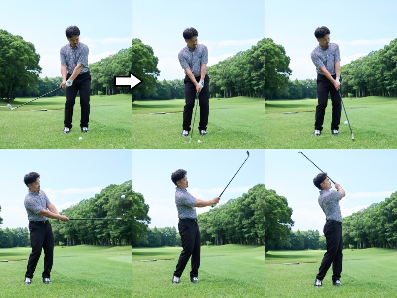 アッパーブローの軌道は、フォローでヘッドを高く上げようとすれば自然に作れます。弾道の頂点と同じ高さまでヘッドを高く振り上げる意識をもって、あとはその惰性でフィニッシュを迎えます。