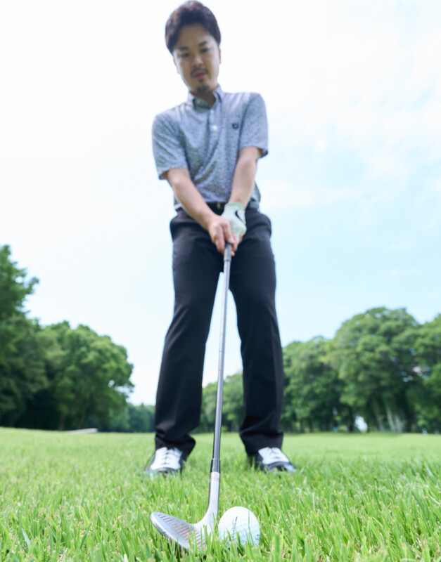 やわらかい球は、ボールの下をすくうように打ちます。イメージとしては、アイスクリームをスプーンですくう動かし方。アドレスはハンドレイトで構えてウエッジのロフトを寝かしたら、スイング中のコックは抑えめに。手先ではなく体の回転で「すくう」インパクト軌道を作ってください。