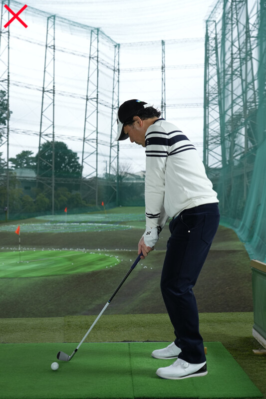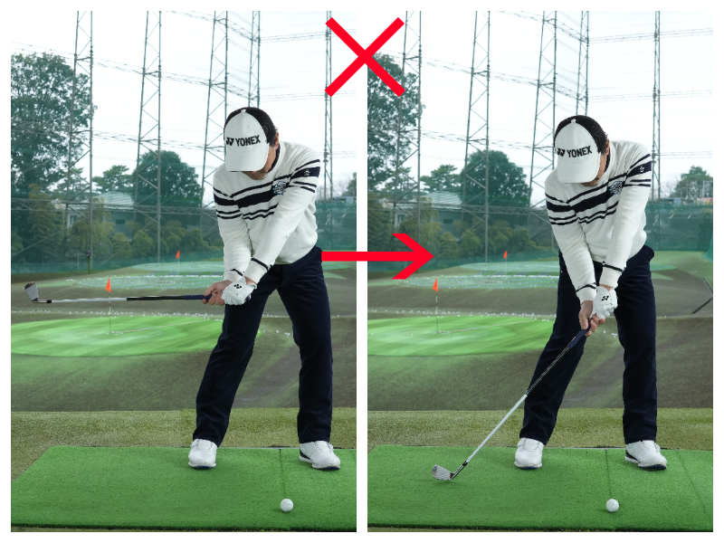 アドレスと同じ形を作ろうとして、体をボールに正対させるインパクトはNG。ヘッドが早く地面に落ちてしまい、ダフリやすくなるので気をつけよう