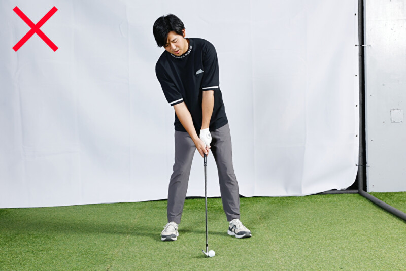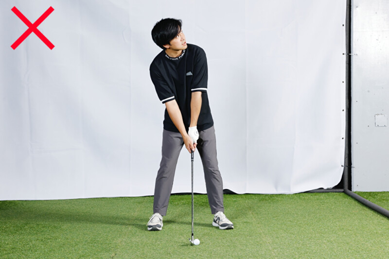 高い球を打つ際に、目線を上げて右足体重で構えるのはNG!(写真上)。なぜならば、スイングの最下点がボールよりも右にきてしまうからです。