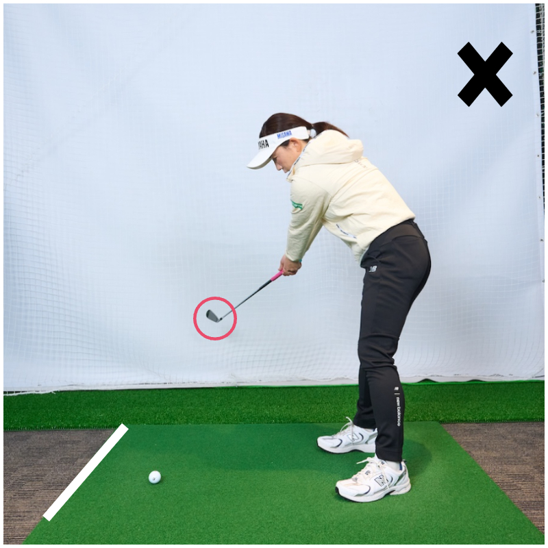 クラブを真っすぐ振り上げると、腕が体から離れて手打ちになってしまう。正しいスイングプレーンに戻すために体の軸を傾けるなどの調整が必要で、ミスショットの原因になってしまう。