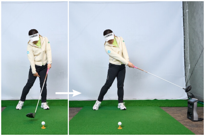 ティーアップして打つドライバーは、アッパー気味の入射角が理想。そのために、切り返しでは右から左への体重移動を行ない、ダウンスイングでは左足を踏み込みながら真上に蹴る。その動作にクラブの動きを連動させると、自然なアッパー軌道を作れる。「手先ではなく、下半身を使ってアッパー軌道を作ってください」(有村)。