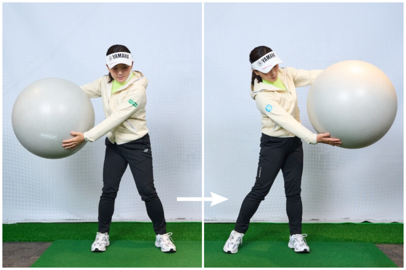 バランスボールを投げる練習がオススメ。練習場のカゴなどの代用も可能で、両手で持ったら踏み込んだ左足を伸ばしながらカゴを振る。この練習で、下半身と上半身の連動を覚えよう。