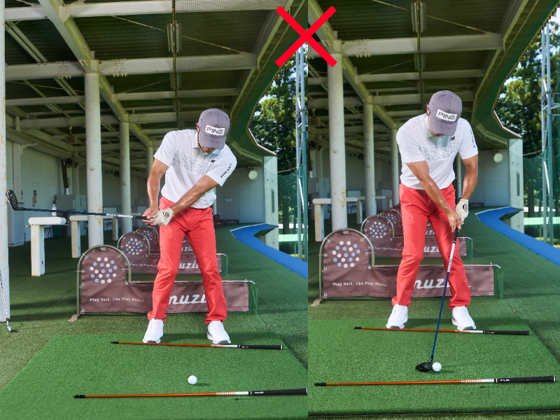 インパクトに向かって体の突っ込みクセがある人は、クラブが上や外から入りすぎてしまう(写真左)。左サイドの壁ができている人はスイングがきゅう屈になり、左ヒジを引いてしまうことも(写真右)。力が逃げてしまうし、フェースが開いて右曲がりの球が出るためクローズスタンスが合わない