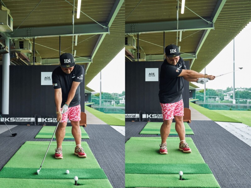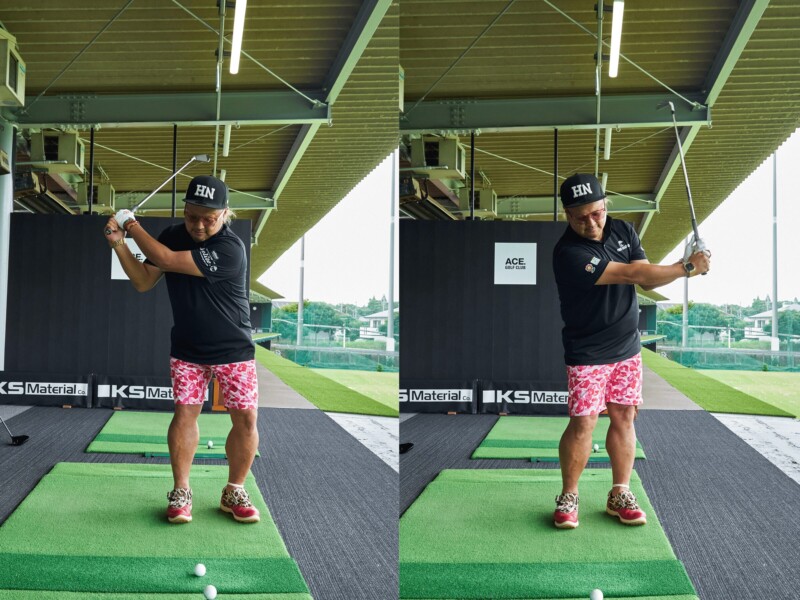 クロスハンド打ちの最大の利点は、右手が不自由になることです。右手のアクションが強すぎる人はバックスイングでコッキング、インパクトからフォローにかけてはクラブを跳ね上げるような過度なリリースを行ないがちで、スイングのアークが小さくなってしまう。