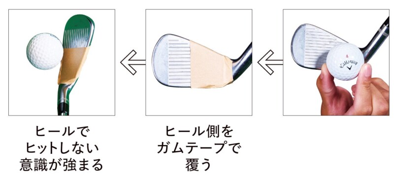トゥ側にズレることが多い人は、フェースのトゥ側をガムテープで覆う。すると、ヒールに当てる意識が強まります。ヒール側にズレる人はヒール側にガムテープを張って打つ。トゥヒットをヒールヒットにすると、本番では相殺されてちょうど真ん中に当たるというわけです。