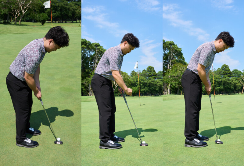 遠く、前傾が浅い構えはラインを手前に傾ける