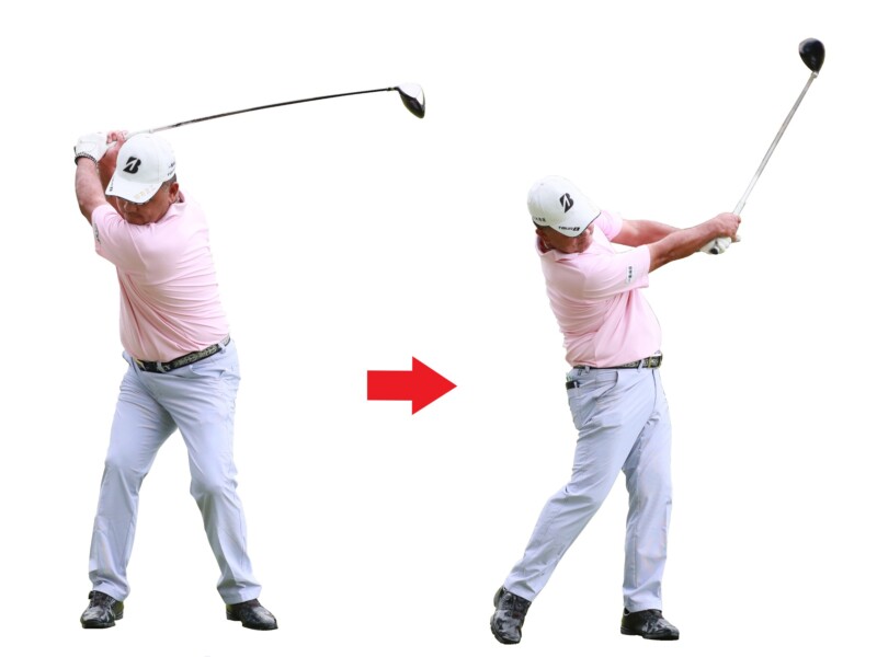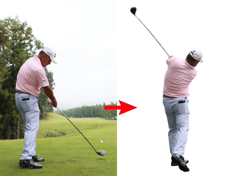 素振りのときスムーズに振れるのは、目の前にボールがなく動きにも制限がかからないため。本番でもボールを意識しすぎなければ、バックスイングでの深い捻転が可能になるうえに、ダウンスイング以降の体の回転力がアップする