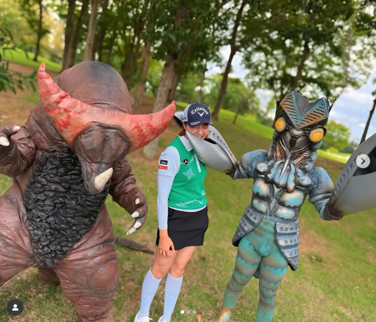 三浦プロは「バルタン星人に負けました」とコメントして、イーグルポイントゴルフクラブ(茨城県)で行われた「日本プロシニア円谷HDウルトラマン杯」での写真を投稿。見ると、バルタン星人に首を切られそうになる三浦プロの姿が。