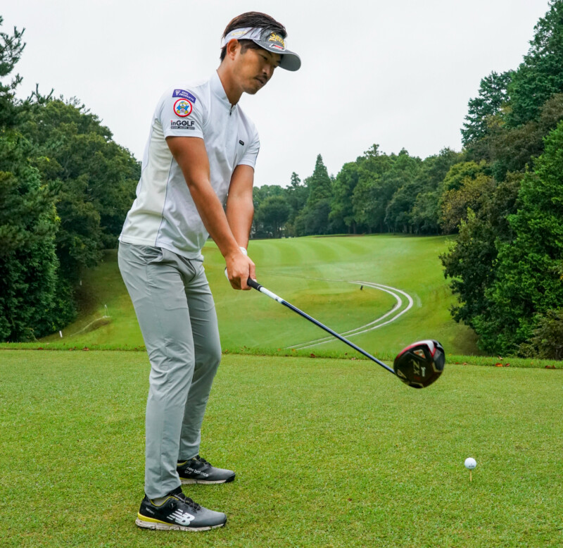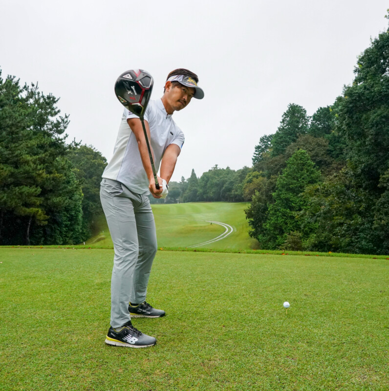 今どきドライバーは極端なインサイド軌道で打たなくてOK。手元は内側、ヘッドは外側に上げていく感覚で振り上げるとフェースが開くのを防げる