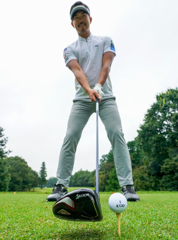 クラブを上から押さえつけて、いかり肩の構えになると上体がリキむ。始動で手元が浮いたり、ヘッドをインに引きすぎてしまう