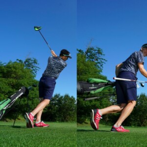 クラブを上から押さえつけて、いかり肩の構えになると上体がリキむ。始動で手元が浮いたり、ヘッドをインに引きすぎてしまう