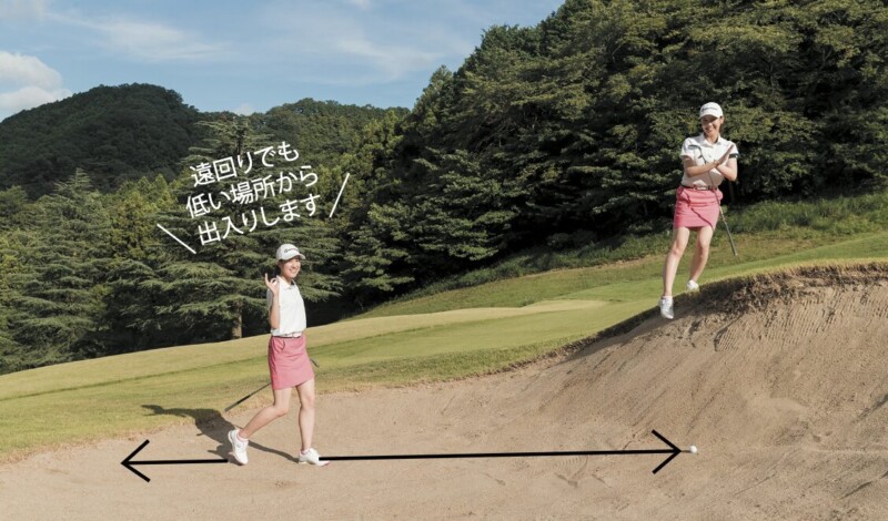 早くボールのある位置に行きたくても、最短ルートを通ってはダメ。バンカーは必ず手前の低いところから入りましょう。アゴがある高い位置から入ると砂がたくさん崩れてしまう。そこをならすのは大変です。低い場所から入ったら、出るときも同じ道を通れば、砂をならす箇所を減らせます。