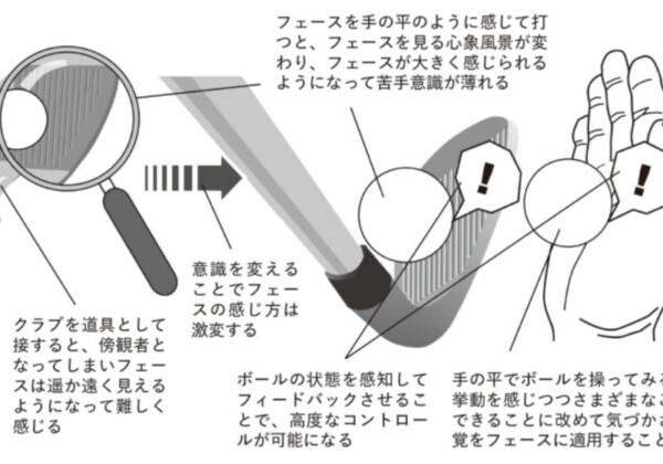 ②ダイナミックエイミングがターゲットラインと平行のスクエアな向きになると、方向性のいいスレート軌道で打てる(右)