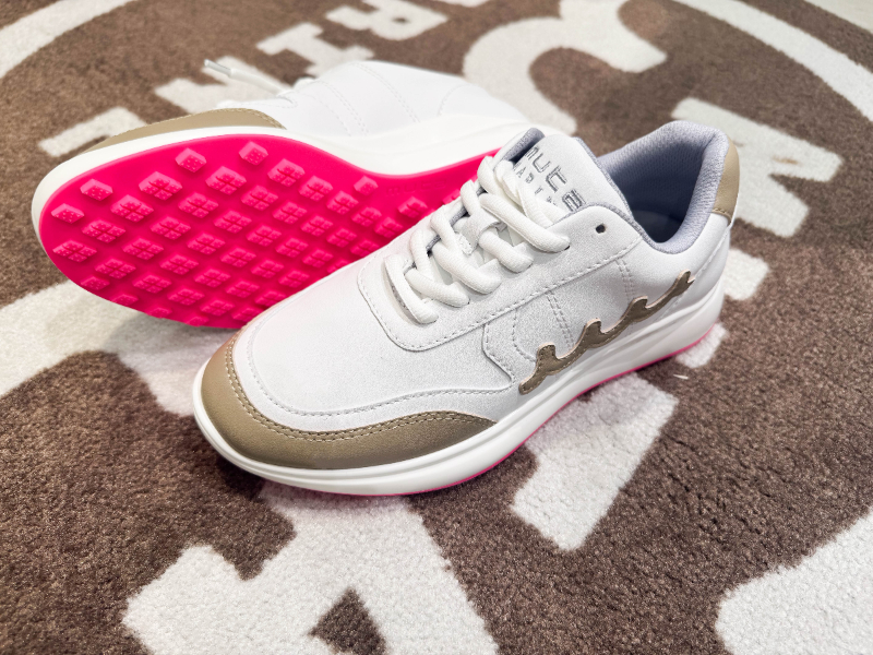 Youtube「ワッグルチャンネル」で俳優の中川大志さんが履いていたmutaのシューズ。「すごく履きやすい!」とコメントしていたので、私も試してみました。4色あるなかから選んだのは、ホワイト×ベージュにビビッドなピンクのソールのスパイクレスシューズ。スニーカーのような見た目で、どんなウエアにも合わせやすそうで見た目も◎。