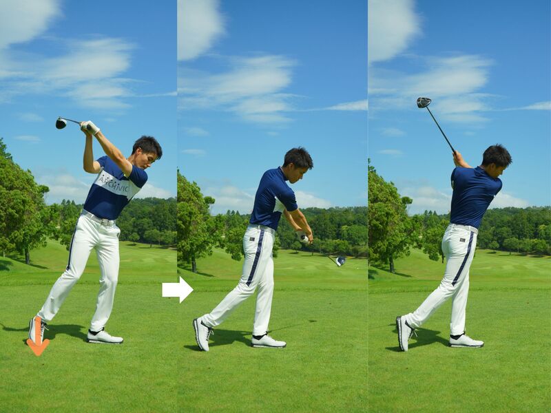 バックスイングで右ツマ先を大きく上げたらダウンスイング以降は下げて、反対の左ツマ先を大きく上げながら腕を振る。スタンス向きやツマ先の向きを変えてみて、足裏にかかった重心のラインが目標を向く感覚になる立ち方を見つけよう。