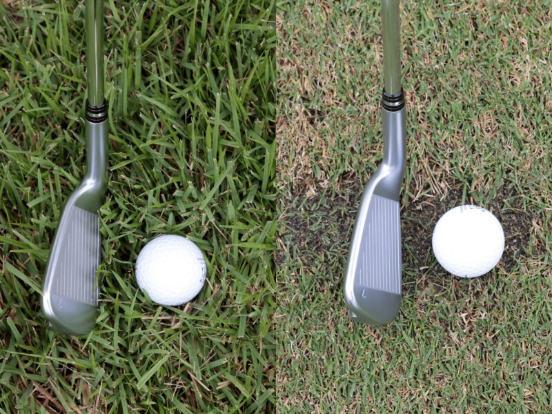 ニュートラル系も広めのソールを活かして、低く長いゾーンでインパクトする(上)。ダフリたくないライでは、あえてフェースの下めでヒットするのも賢い使い方(下)