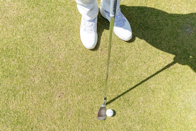 アプローチでのハンドファーストは、間違いではありません。ただし、そのイメージが強すぎて過度なハンドファーストになっているゴルファーが多く見られます。どのクラブもロフト角どおりに構えて、ロフト角どおりに打つことが基本。アドレスではシャフトが地面に対して、ほぼ90度になるように構えましょう。