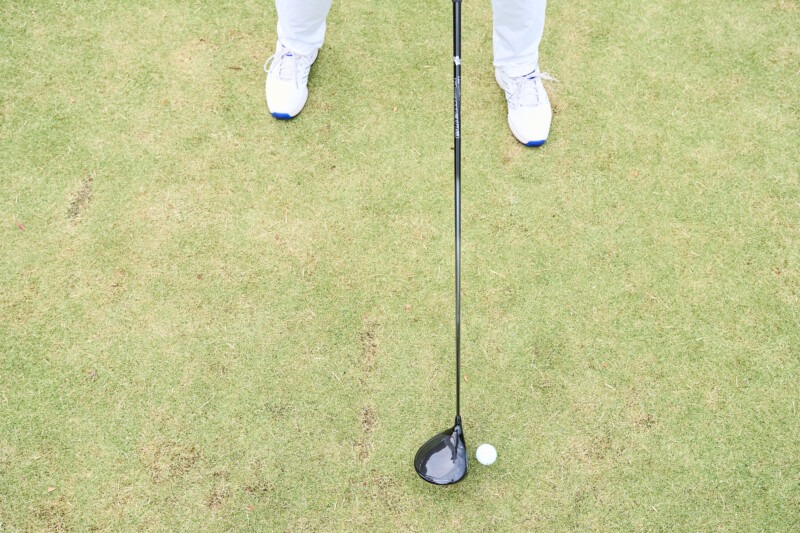 ドライバーはティーショットで使用するため、ボールは左足のかかとの延長線上に置くのが基本です。ボールを左側に置くことで、スイング軌道の最下点を過ぎたタイミングでインパクトでき、アッパーブローの軌道を描いてボールを高く遠くへ飛ばすことができます。