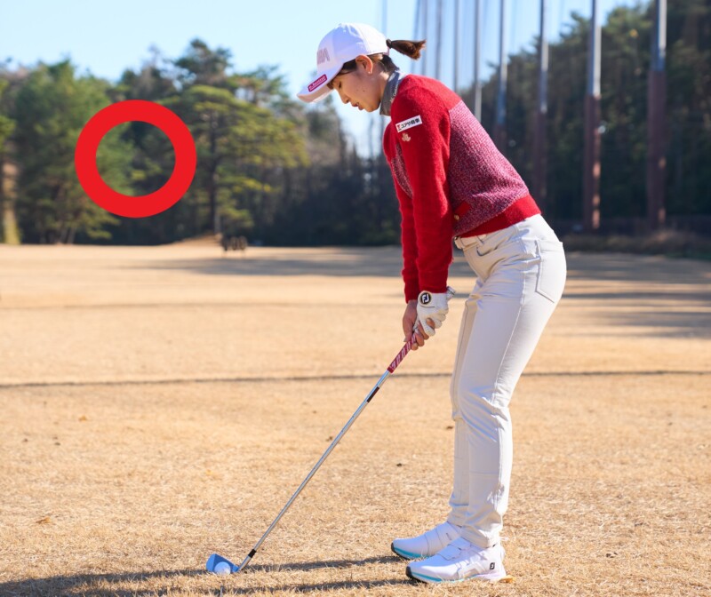 ボールは半個から1個ぶん左にセット。ボールの近くにスパットを設定し、それを見ながらアドレスを作れば、肩が開かずにスクエアな状態をキープできる
