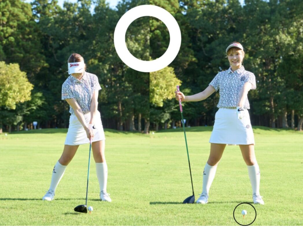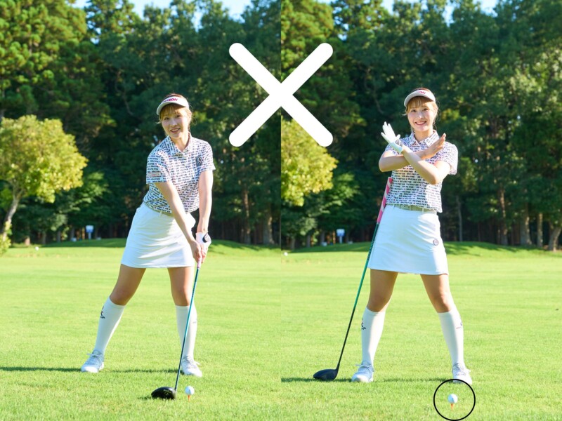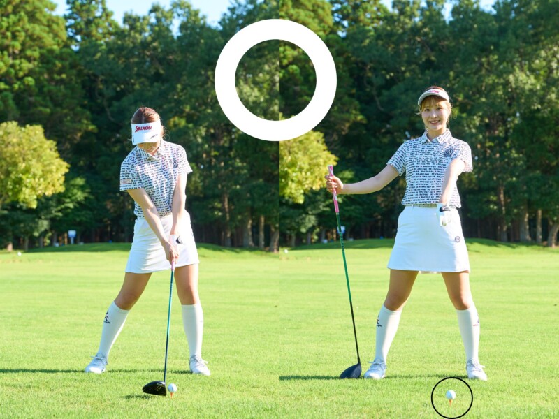 「安定しないのはスイングの前にボール位置が原因かもしれませんね」とミヤコレ。ボール位置はドライバーだと内側すぎる人は少ないが、普段より外側にセットしてしまうことはよくある。ミヤコレの場合のセット位置は、左足より内側。体の正面をスイングの最下点として、最下点をすぎたのちにアッパーブローでインパクトを迎える(○)。その再現性と安定性を高められるボール位置にしている。