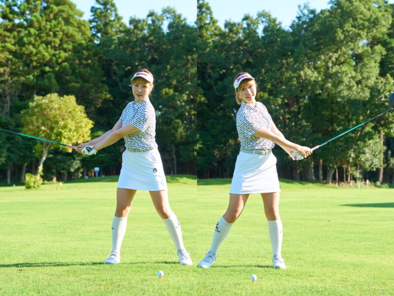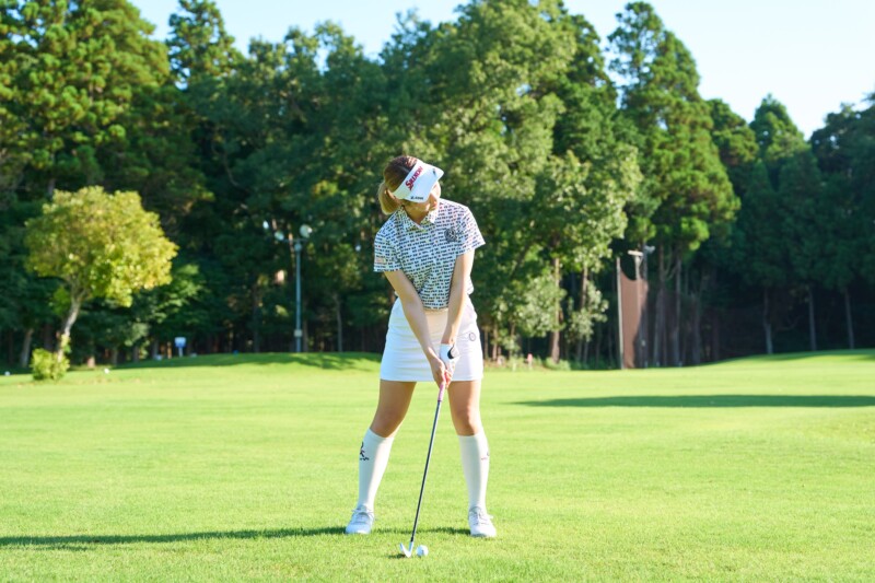 すぐさま左右に足踏みできて、体と腕を揺さぶれる力感で構える。「打つ前にこの“さゆさゆ”をしてからアドレス、スイングへと入っていくのもオススメですよ」(ミヤコレ)
