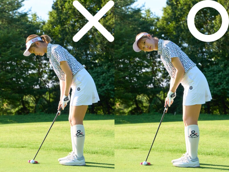 ミヤコレのアドレス(○)。上腕とシャフトが一直線になるハンドアップの構えで、大きな筋肉を使ってストロークする。手首のタテ方向に角度がつく構えは、手首がヨコ方向に折れやすく、再現性や安定性に欠ける(×)