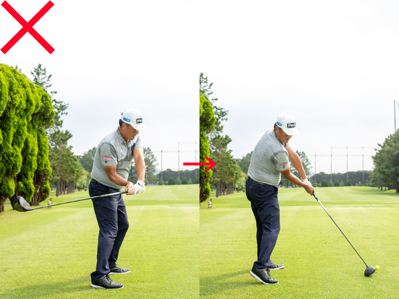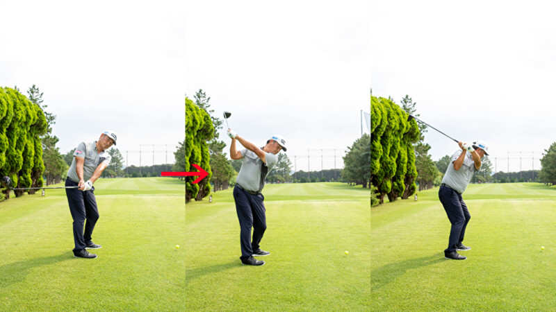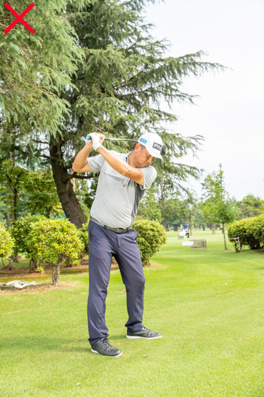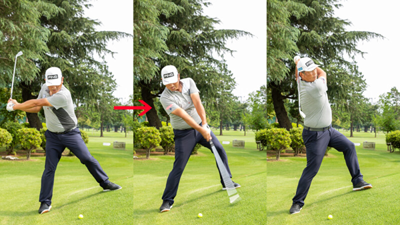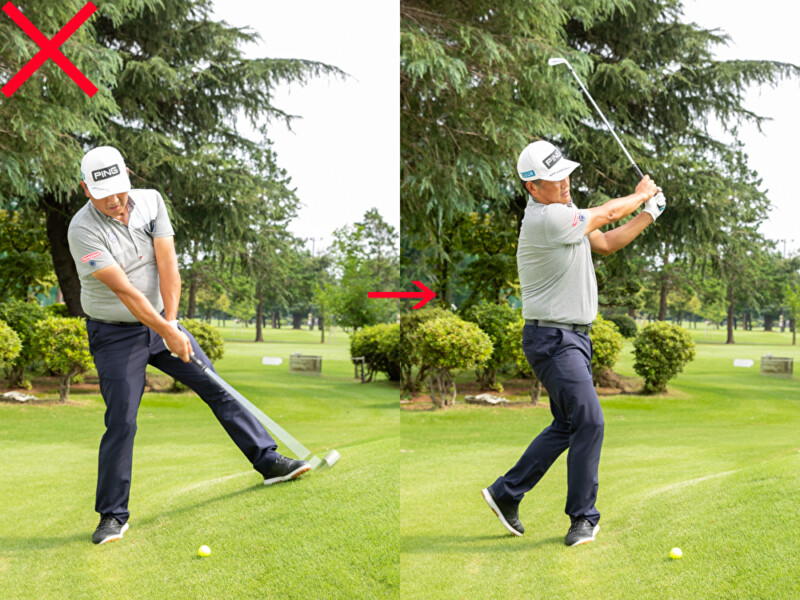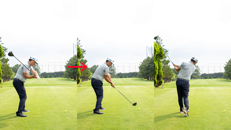 バックスイングでクラブをインサイド方向に低く上げていくと、アウトサイド・インの軌道で振りやすくなる