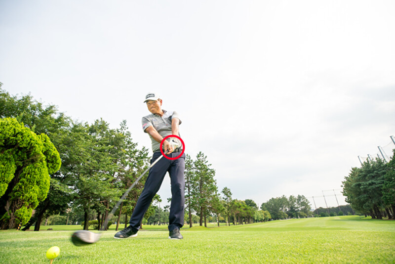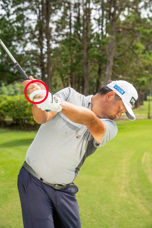 体や腕を緩めた素振りでは、トップで左手グリップが緩みやすい。グリップの形も変わってしまうので、さまざまなミスショットを招く。