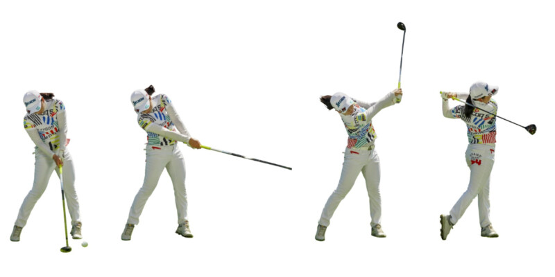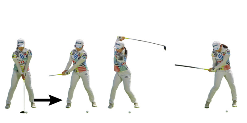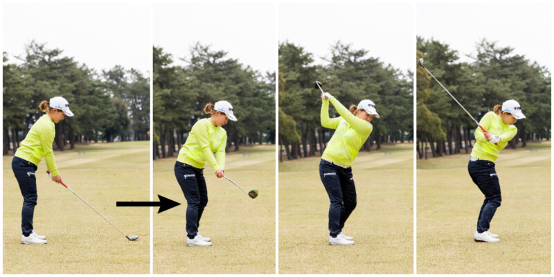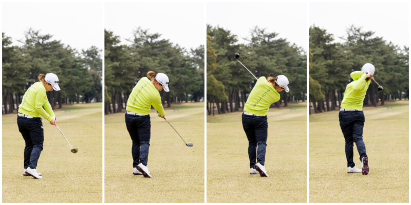 永井選手のように小柄な人ほどオーバースイングで飛ばそうとしますが、彼女のスイングはじつにコンパクト。腕の動きが少なくトップの位置が浅い。上半身の動きを抑えているので、トップもコンパクトになっている(❸)。そのぶん下半身をしっかり使って、ミート率を上げて飛距離を伸ばしています。
