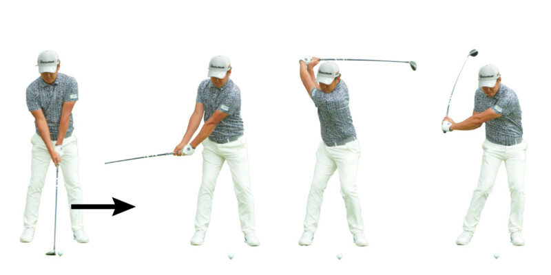 小祝選手のスイングの特徴は、❶のアドレスから❽のフィニッシュまで腰のラインが地面と平行なこと。アマチュアは、球を上げようと思って切り返しからインパクトにかけて左腰が上がることが多いですが、左腰が上がるといい感じにインサイドからクラブを下ろすことができてもダフる確率が高くなってしまいます。一度ダフってしまうとダフリたくないという思いから、クラブをアウトサイドから下ろしてミスになるという悪循環も起こりがちです。