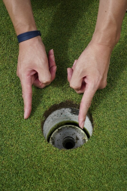 カップのハイサイド(高いほう)に向けて斜めに狙う! 絶対に入れたいパット ライン取り