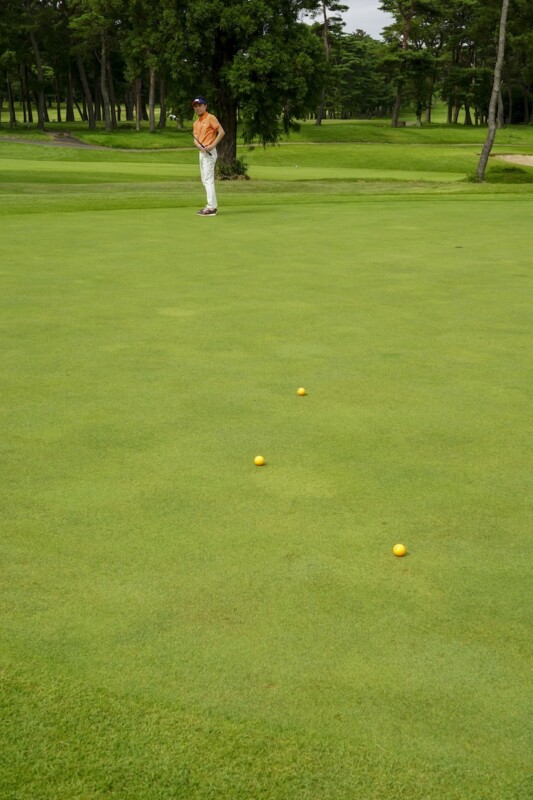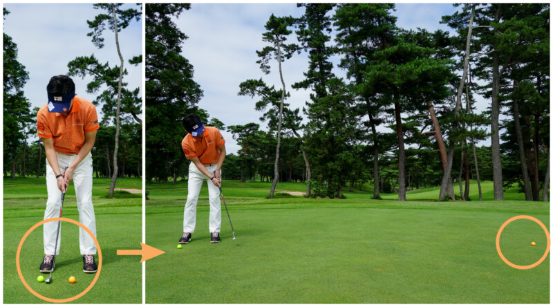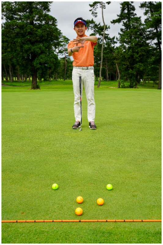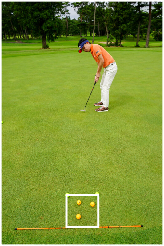 距離感をつかむにはカップインさせるのではなく、狙ったゾーンに止められる距離感が重要。3球連続で止められれば、完璧な距離感が身につきます。