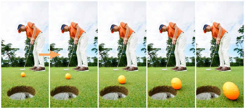 斜めのライン取りを覚えてタップ打ちをマスターしたら、カップインのカギを握るのは距離感です。入れごろ、外しごろの距離といわれる2メートルくらいの距離感をつかむには、狙ったところにボールを止められる「マイゾーン」を作る練習がオススメです。